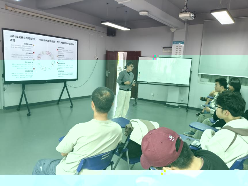 随後,教師王新宇圍繞賽事核心内容展開細緻解讀。他結合官方文件,明确了校賽、省賽、國賽三級賽制的全流程時間節點,重點标注了各階段關鍵截止時間與不同賽區的賽程差異,幫助師生精準把控備賽節奏;同時全面梳理了賽事11個競賽大類的設置,重點解讀了數媒相關賽道的創作要求,标注了适配本專業學生參加的賽項,明确了本年度賽事“中國古代建築成就”的核心主題;并詳細講解了參賽組隊資格、作品原創性規範、AI工具使用要求等核心标準,幫助師生規避創作與參賽過程中的常見問題。