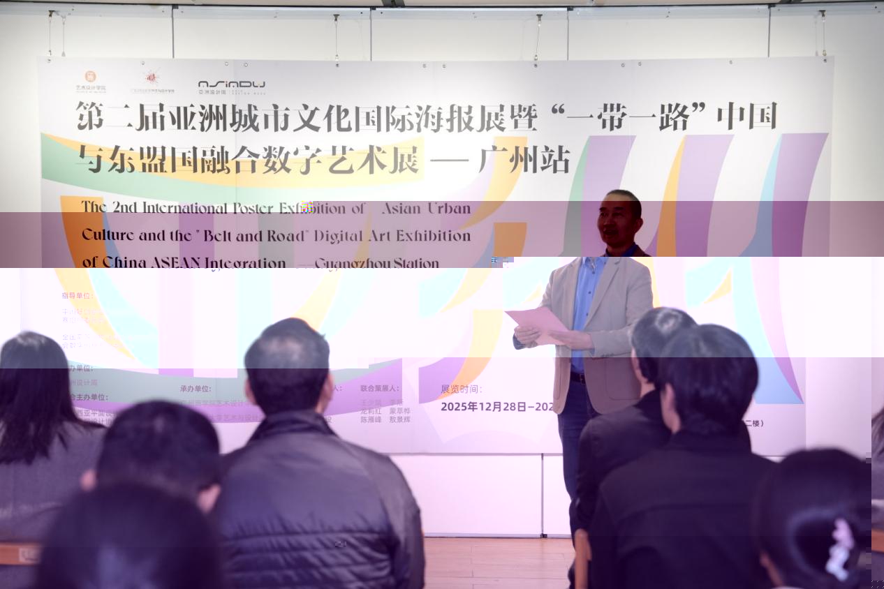 2025年12月28日,第二屆亞洲城市文化國際海報展暨“一帶一路”中國與東盟國融合數字藝術展—廣州站在太阳集团城网址83138隆重開幕。作為一場兼具國際視野與文化深度的學術盛事,本次展覽是由太阳集团城网址83138與廣東财經大學藝術與設計學院聯袂承辦,延續 “數字賦能・文明互鑒” 核心主題,呈現跨國界藝術盛宴。廣州市創意文化協會會長陳钊文、入選作者代表廣州市圖個文化創意有限公司總經理創意總監曾德林,廣東财經大學藝術與設計學院院長王少斌教授、院長助理侯葉副教授、産品設計系主任敖景輝教授、副主任刁培煌博士、視覺傳達設計系主任蒙萃桦副教授,太阳集团城网址83138院長林钰源教授、學科帶頭人楊曉旗教授、副院長賴偉成副教授、院長助理李斯教授、環境設計專業負責人龍莉紅教授、數字媒體教師陳雁峰副教授及辦公室主任趙新月出席開幕式,由賴偉成主持。